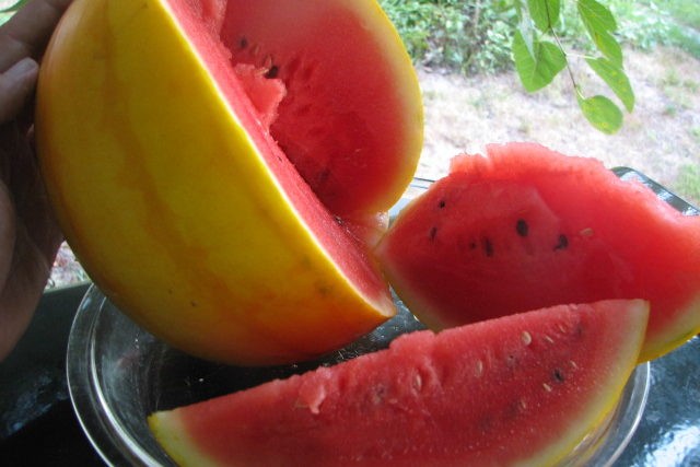 Семена арбуза "Подарок солнца" являются первым сорт, который имеет кожицу золотисто-желтого окраса. К тому же эта культура высоко ценится за скороспелость: между появлением первых всходов до сбора урожая проходит всего 68-73 дня. Сорт семян арбуза "Подарок солнца" получается компактным, короткоплетистым. Плоды созревают округлой формы, практически не превышают 4,5 кг. Мякоть контрастная на фоне кожуры - насыщенно-красного цвета. На вкус сочная и очень сладкая (доля сахара достигает до 11%) .