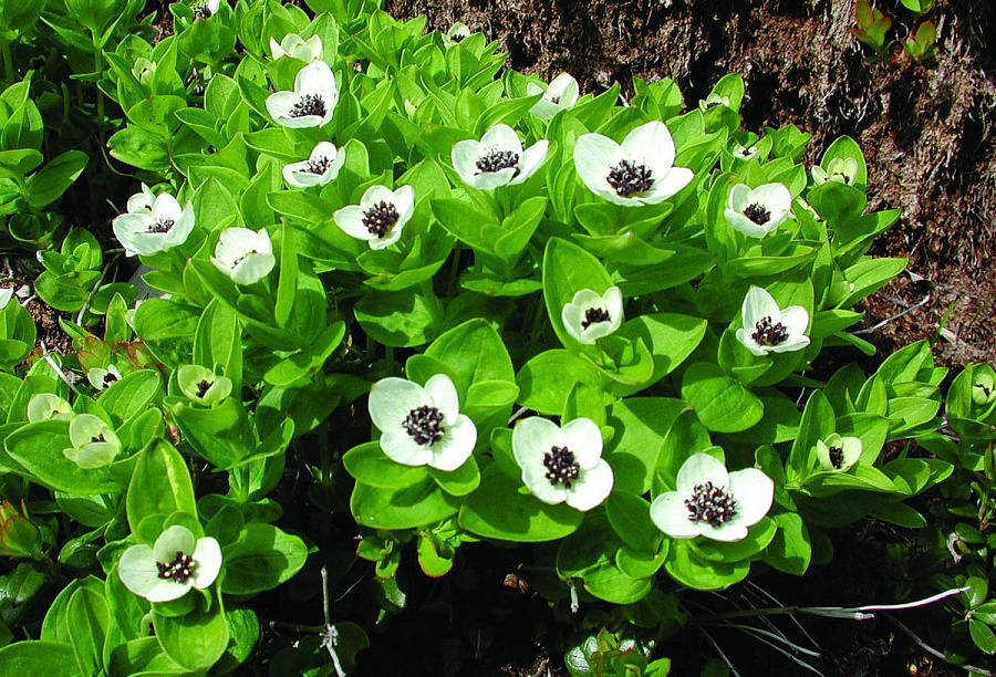 Саженцы канадского дерена образуют эффектные ковры, плотно покрывая почву зеленой листвой. Во время интенсивного цветения карликовые кустарники выпускают множество белых цветов, которые затем становятся красными неядовитыми ягодами. Используется в качестве почвопокровного растения.