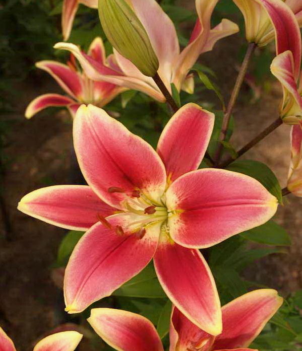Луковицы лилии ОА-гибрид Элегант Краун (Lilium OA-hybrids Elegant Crown) – это яркость, оригинальность и дополнительное внимание к любому цветнику. Необычность двуцветной окраски цветка – в комбинации сочных оттенков. Основание лепестков ярко-желтое, середина ярко-розовая, кончики снова желтые. По всему краю расположена четкая желтая окантовка, на каждом лепестке – продольная красная полоса, цвет которой дублируется цветом легкого крапа в сердцевине цветка и пыльниками на желтых ножках. Многолетник расцветает в июне и к этому времени достигает 110 см в высоту. Хорошо смотрится в ярусных и групповых посадках.